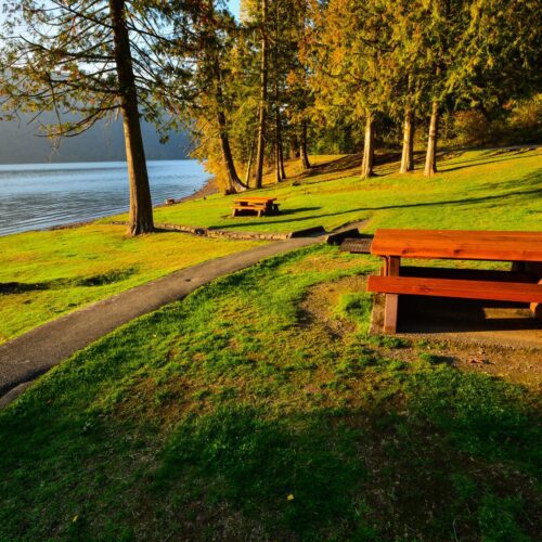 This park is one of the most popular destinations in the Lower Mainland, particularly on weekends during the summer. The park is encompassed by a large, warm, freshwater lake surrounded by forest-clad mountains. The lake offers ample opportunities for fishing, hiking, picnicking, and exploring the lake from the comfort of a small motorboat. Canoe, kayak, and stand-up paddleboard rentals are available. 25 comfortable, wheelchair-accessible, and very sought-after cabins are available to rent in Maple Bay; For booking go to bcparks.ca.